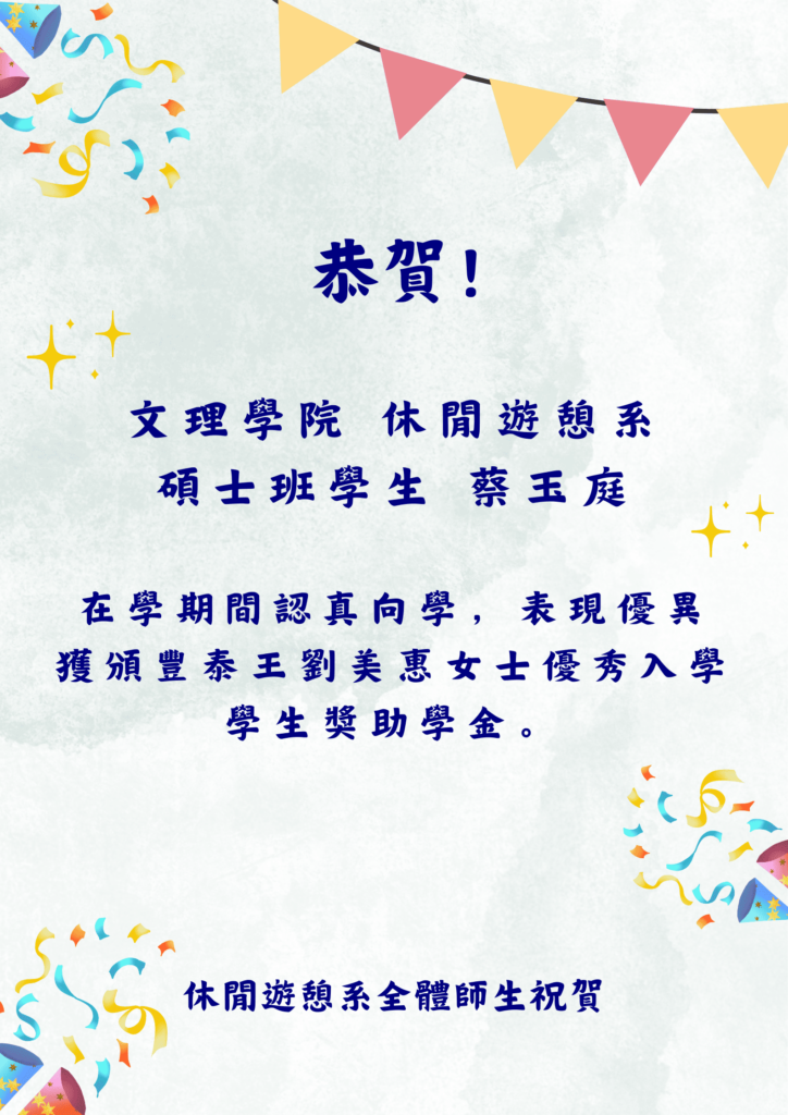 本系硕士班学生 蔡玉庭,在学期间认真向学,表现优异获颁丰泰王刘美惠女士优秀入学学生奖助学金。 2024-12-04 AdminAdmin 恭贺 休閒游憩系 硕士班学生 蔡玉庭,在学期间认真向学,表现优异获颁丰泰王刘美惠女士优秀入学学生奖助学金。