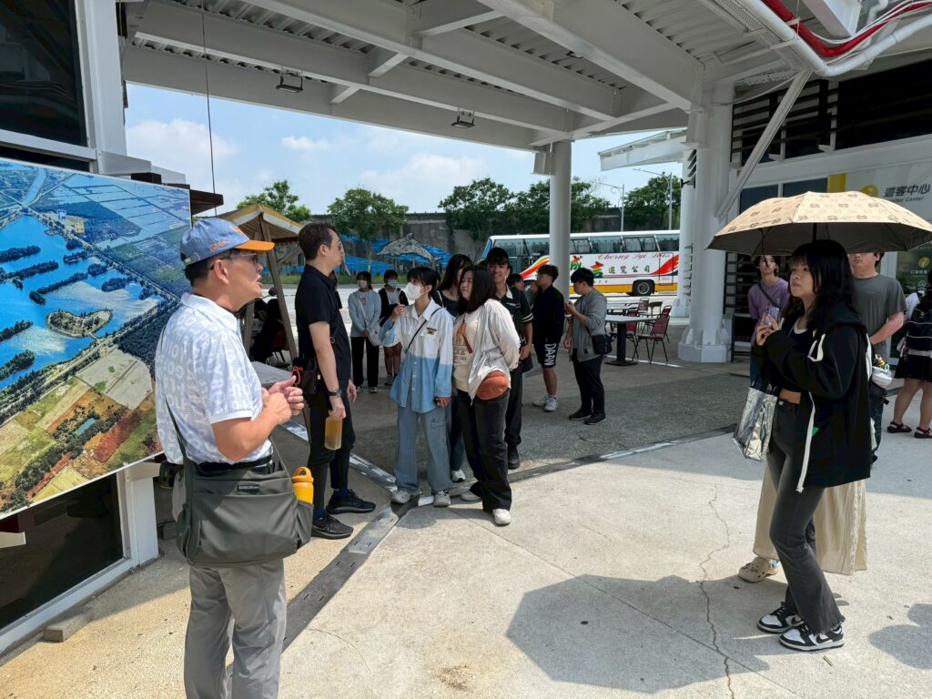 導覽過程中,也介紹了口湖地區豐富的人文背景與在地產業特色,例如漁業與農業等,讓參與者能更全面地認識這座濱海鄉鎮多元的風貌。隨後我們來到椬梧滯洪池,這個原本作為防洪蓄水用途的設施,如今已結合休閒與觀光功能,不僅提供民眾親近自然的空間,也展現出水利設施與環境永續共存的可能性。