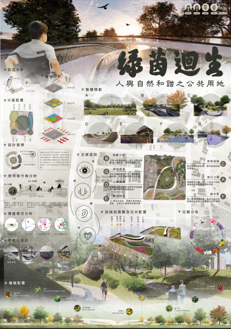 科技的進步,使人與自然的距離不斷拉大,進而對健康產生了負面影響,為了創造一個融合人與自然的生活空間,尋找科技和大自然之間的平衡點,打造增進情感和諧的公共綠地,本團隊選定臺中廍子公園作為基地,目標是以「共享」為設計主軸,致力於健康福祉城市和可持續發展性,以原生基地透過具有美學的設計原則,並對其分區規劃及使用者族群提供不同休憩場域空間。