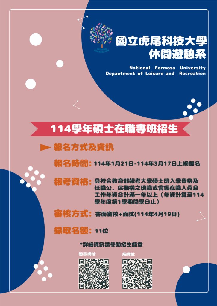 - 報考資格:具符合教育部報考大學碩士班入學資格及任職公、民機構之現職或曾經在職人員且工作年資合計滿一年以上(年資計算至114學年度第1學期開學日止)